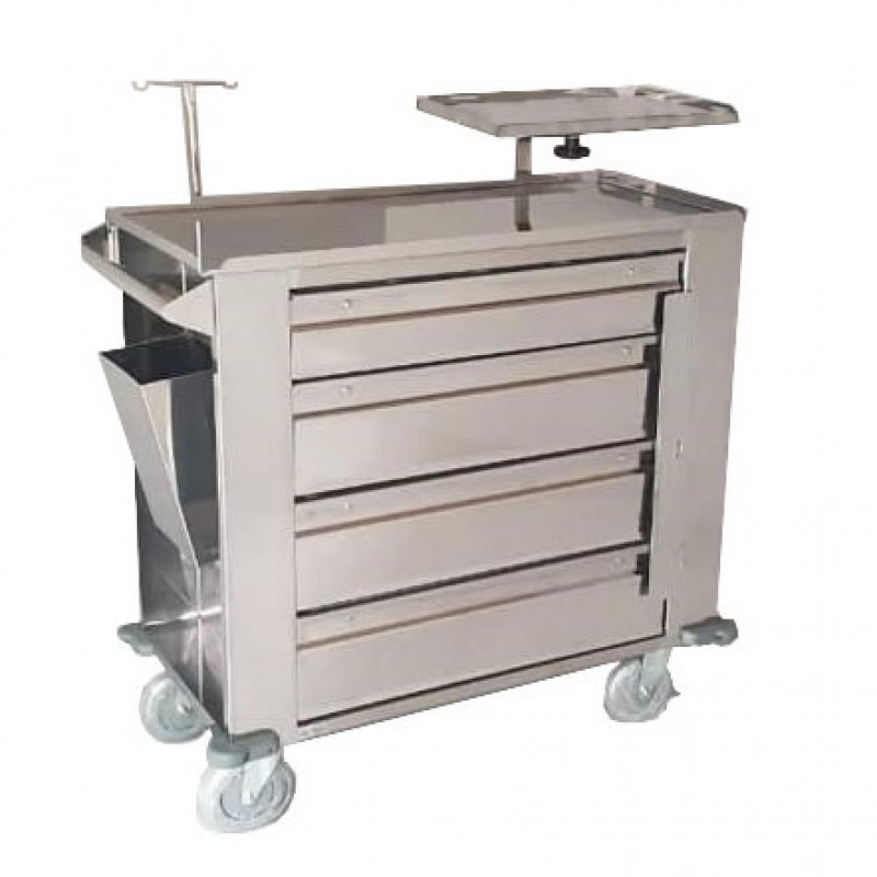 Confeccionada em chapa de aço inoxidável de 0,80 mm, possui 4 gavetas com divisórias para medicamentos, sistema de trava simultânea para gavetas e pára-choque para proteção de parede.