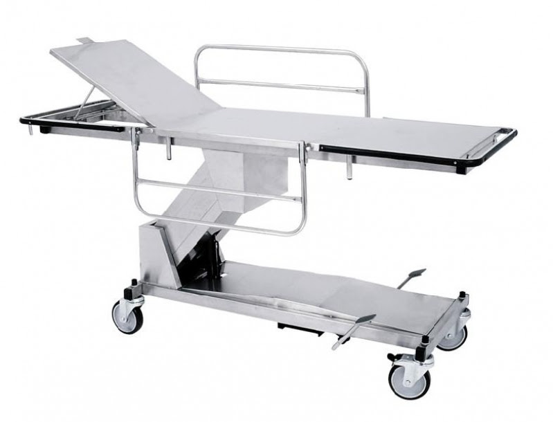 Confeccionado em chapa de aço inoxidável, estruturado com tubo de aço inoxidável, dorso com elevação de altura através de cremalheira, para-choque para proteção de parede, suporte de soro e suporte de cilindro para oxigênio em aço inoxidável.