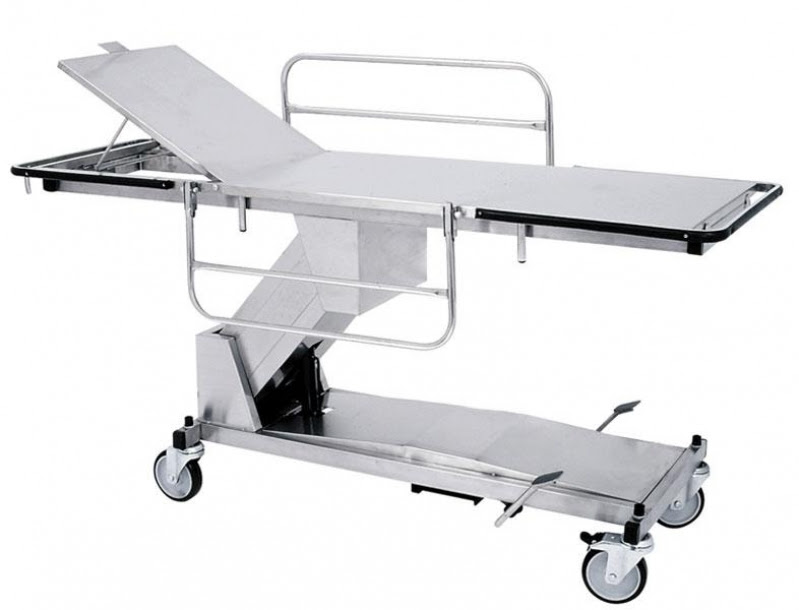 Confeccionado em chapa de aço inoxidável de 1,20 mm, estruturado com tubo de aço inoxidável de 25 x 25 x 1,20 mm, dorso com elevação de altura através de cremalheira, para-choque para proteção de parede e suporte de soro.