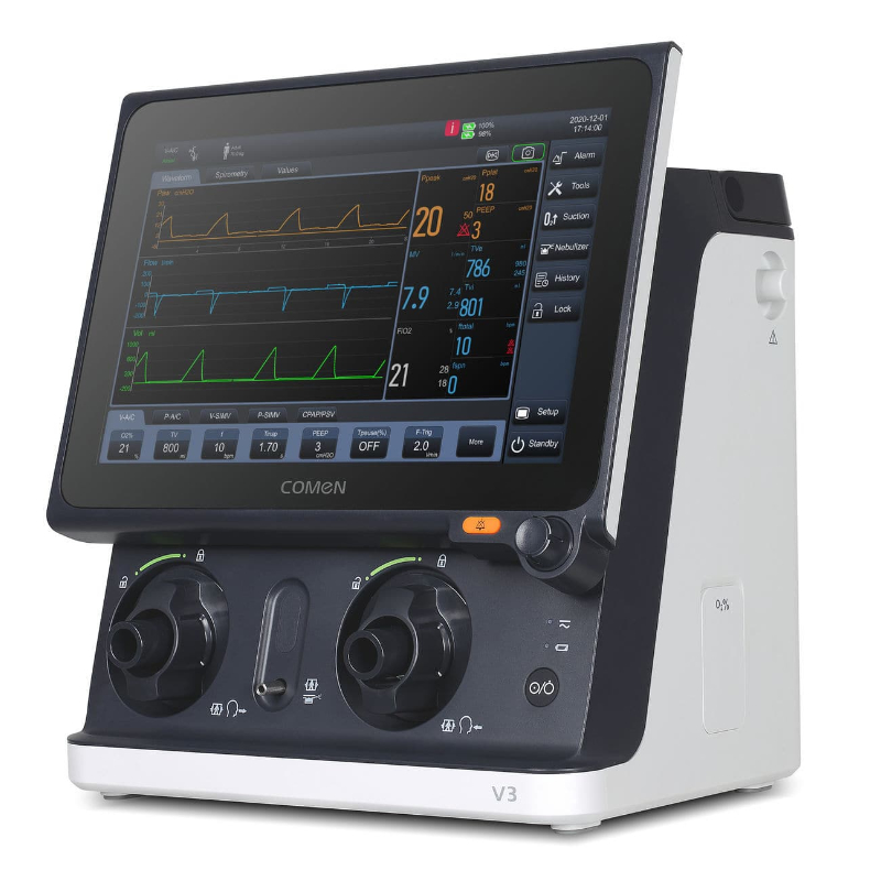 Estrutura principal pequena e leve Bateria de lítio de alta capacidade incorporada Cuidados Críticos Profissionais e Eficazes Com modos de ventilação extensiva e técnicas de sincronização inteligentes, a V3 oferece uma gama completa de tratamentos: O2 therapy- monitoring- desmame. Terapia não invasiva – Terapia NIV e O2 Compensação de fugas excepcional Turbina ultra-silenciosa.
